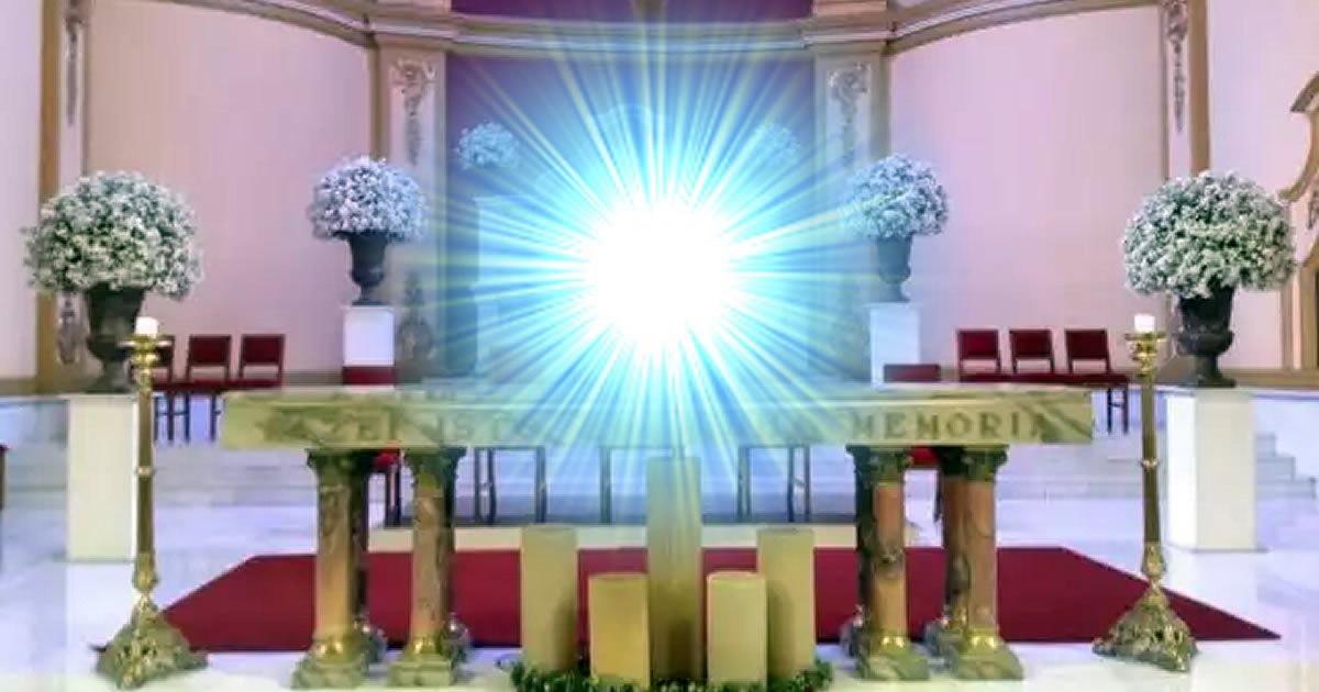 Novamente, cheguei à Igreja de São Sebastião acompanhado pela Cecília, às 16:30. Começamos a rezar o Terço logo em seguida. Como da vez anterior, exatamente às 17 horas, a luz azulada e brilhante começou a formar-se no topo do Sacrário. Ela desceu para a mesa do altar-mor, e finalmente para a mesa da celebração. Ouvi dela a mesma voz delicada e macia, que me saudou assim: