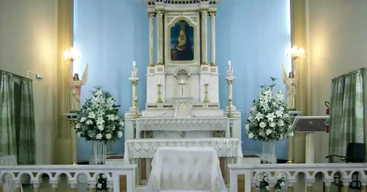 Cheguei à capela do Colégio Monte Calvário às 16:15, para rezar o Terço e esperar por Nossa Senhora, conforme o seu desejo manifestado no dia 1º de março. A capela estava enfeitada e repleta de gente. Havia flores na mesa do altar-mor.